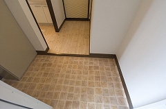 | 腰下を貼り替えた和室は、イメージ通りのものになりました。 | 玄関には、テラコッタ調のシートを貼りました。 |
