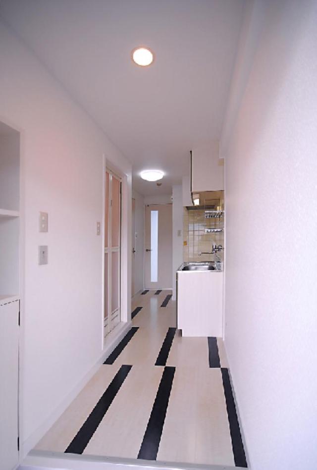 | 玄関に入ると、白と黒の床の貼り分けが印象的です。奥行き感もでてお部屋が広く感じます! |